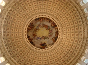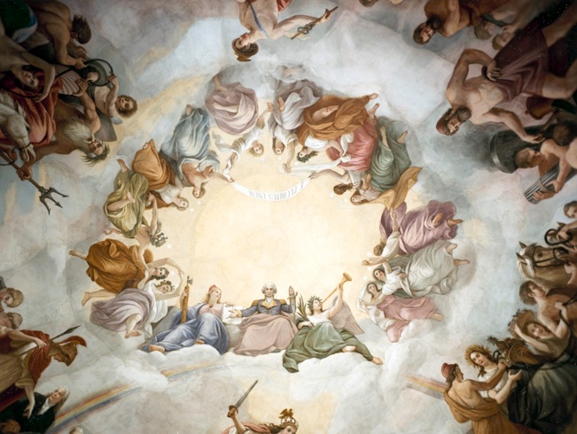 We can see George Washington flying on a rainbow into the heavens on the rotunda ceiling.