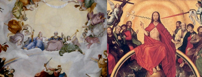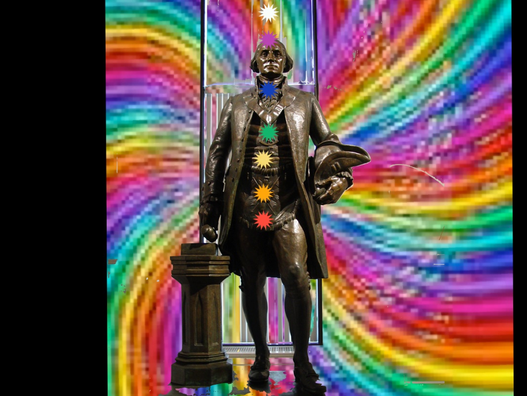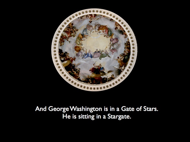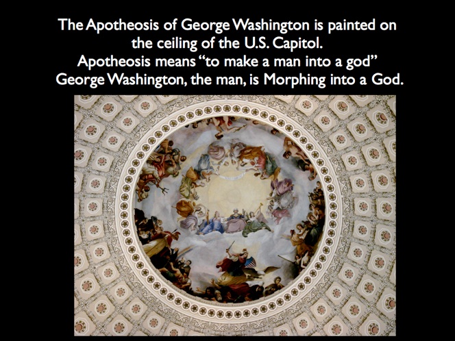 On the Ceiling of the US Capitol George Washington is portrayed as JESUS, wearing a purple robe and riding on a rainbow. George Washington has activated the Human Light Body.