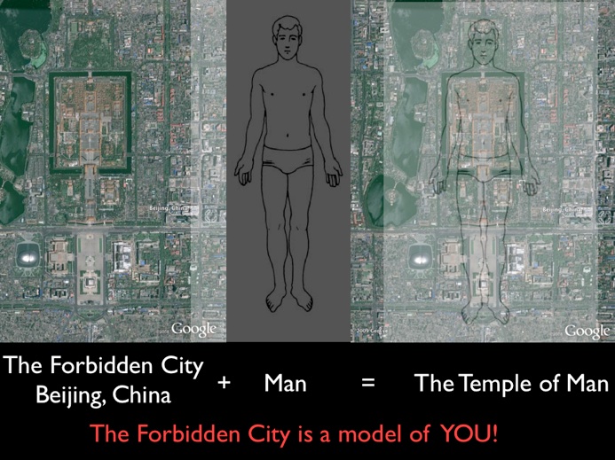 The Forbidden City in Beijing China is a model of the Human Body. You enter at the feet and ascend through the body and enter the Dome of Heaven, the Human head. There are Gates and Pavilions and Temples that are all symbolic of Cosmic Doorways that exist in the Human Body. The Forbidden City is a map to your Mystical Anatomy.