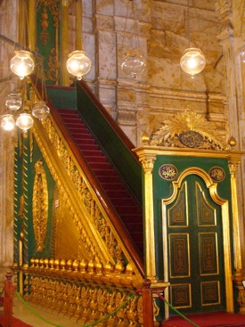 The minbar is located to the right of the mihrab, the niche that indicates the direction of prayer (i.e. towards Mecca).